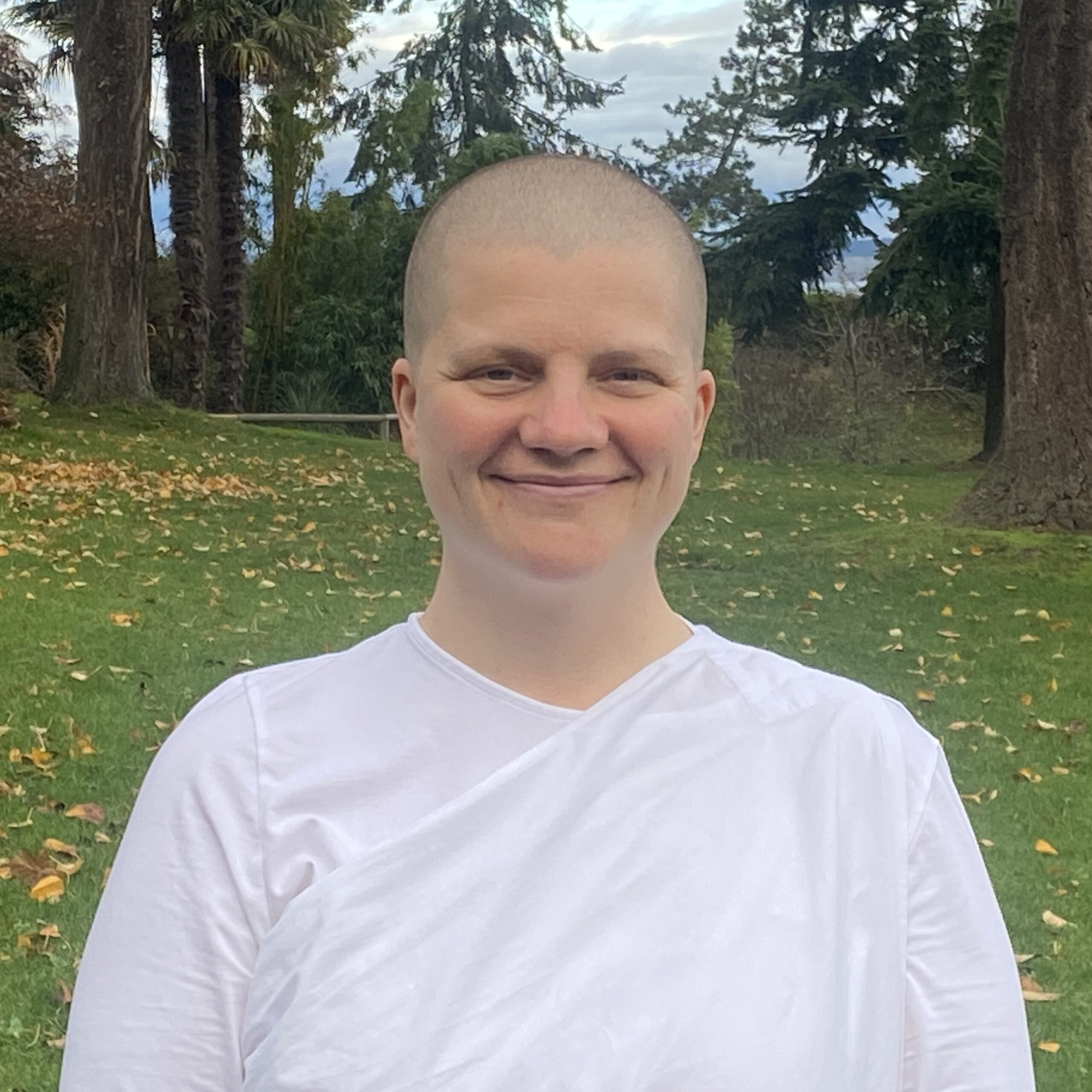 Her practice has continued to deepen since then, with renunciation becoming increasingly important. She has explored many spiritual traditions and tools and was particularly drawn to Theravada Buddhism. She found her way to the Clear Mountain Monastery community in 2022 and was thrilled when Ayya Anandabodhi landed in the PNW soon thereafter. In July 2024, she took the eight precepts from Ayya Anandabodhi and explored a lay renunciate lifestyle, with an intention to await the right conditions to allow her to go forth. She served three months at Parayana between January and April 2025 and in November 2025, took on the Anagarika training at Parayana Vihara.