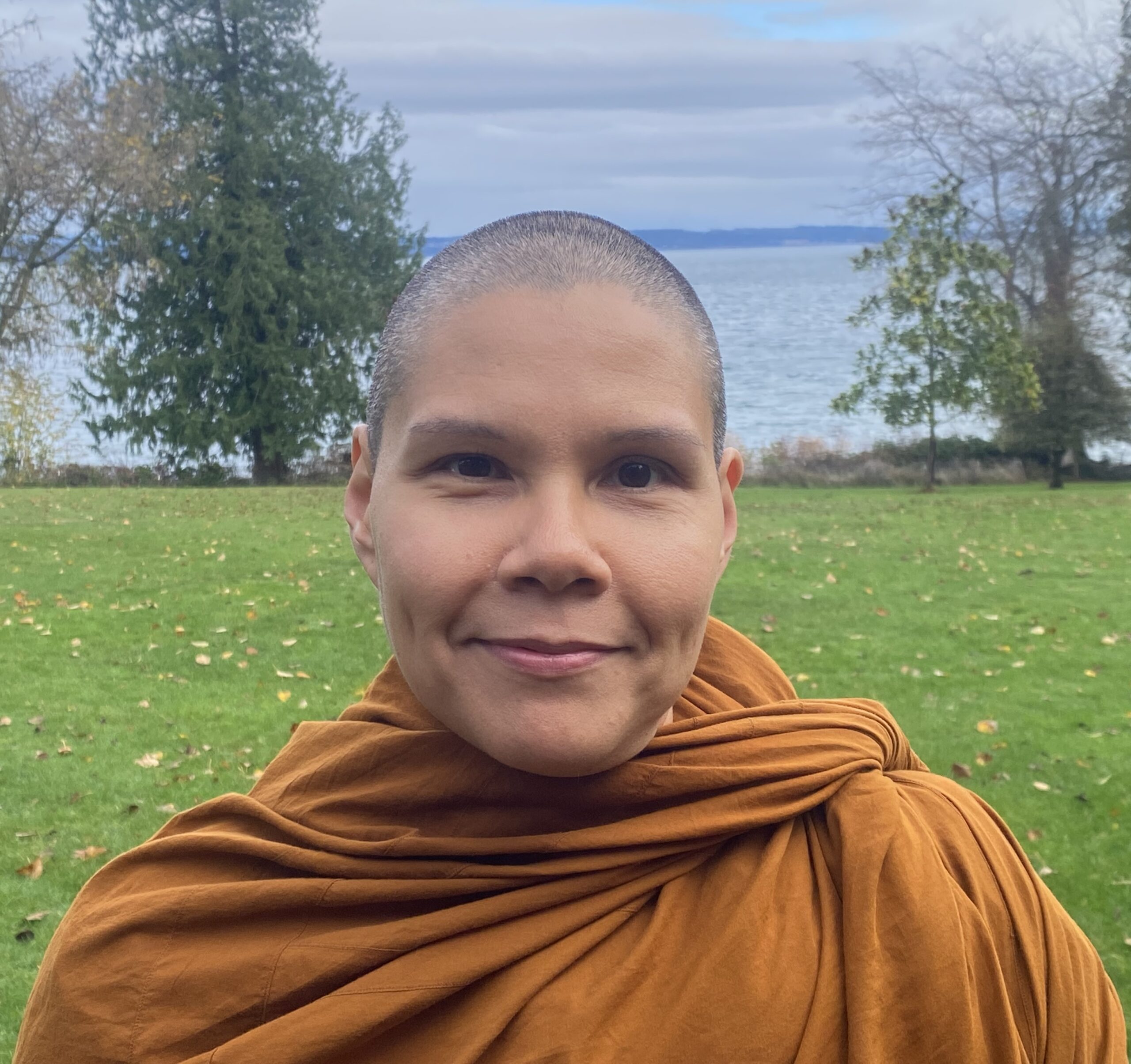 Ven. Sīlānandā grew up in Alexandria, Virginia as the only child of a Filipino immigrant father and Caucasian-American mother. She received a BA in sociology and a MA in public administration before working for seven years as a program and policy analyst in the U.S. State Department’s Bureau of Refugees, Population, and Migration and Office to Monitor and Combat Trafficking in Persons. Ven. Sīlānandā studied Buddhism during her senior year of college and became affiliated with the Insight Meditation of Community of Washington in 2014. After living and teaching English at a monastery in Nepal in 2016, she moved to Sravasti Abbey, a training monastery in the Tibetan tradition near Spokane, WA. She took novice ordination as Ven. Thubten Kunga under Venerable Thubten Chodron in 2019, and full ordination under Venerable Master Wuyin in Taichung City, Taiwan in 2024. In November 2025, Ayya Ānandabodhī ordained Ven. Sīlānandā Bhikkhunī into the Theravada monastic lineage, with Bhante Sumitta Maha Thero serving as the presiding monk elder.