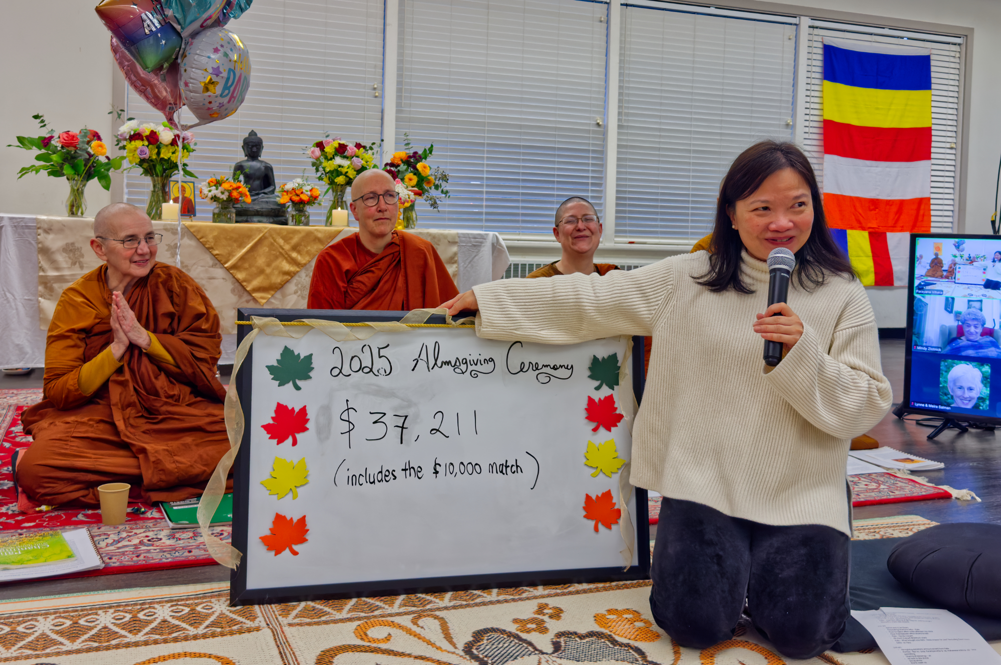 Kate Hathirat, Parayana Vihara’s Board Treasurer, sponsored this year’s Almsgiving Ceremony and also led a matching gift campaign that raised over $38,000 to support the bhikkhunis. Many useful household items were also offered alongside the traditional robe cloth, which will be used to make a lower robe for one of the Parayana Vihara bhikkhunis.