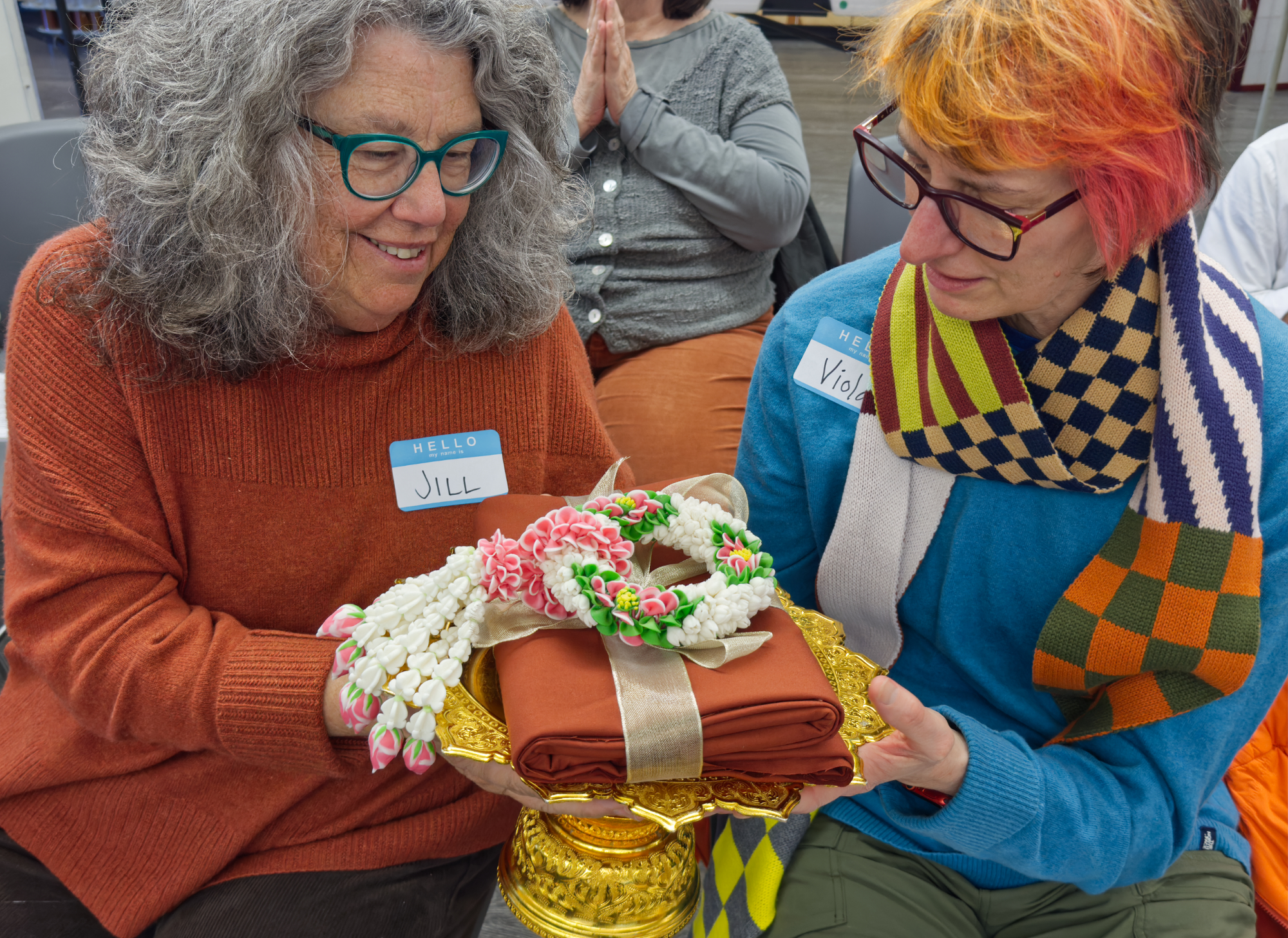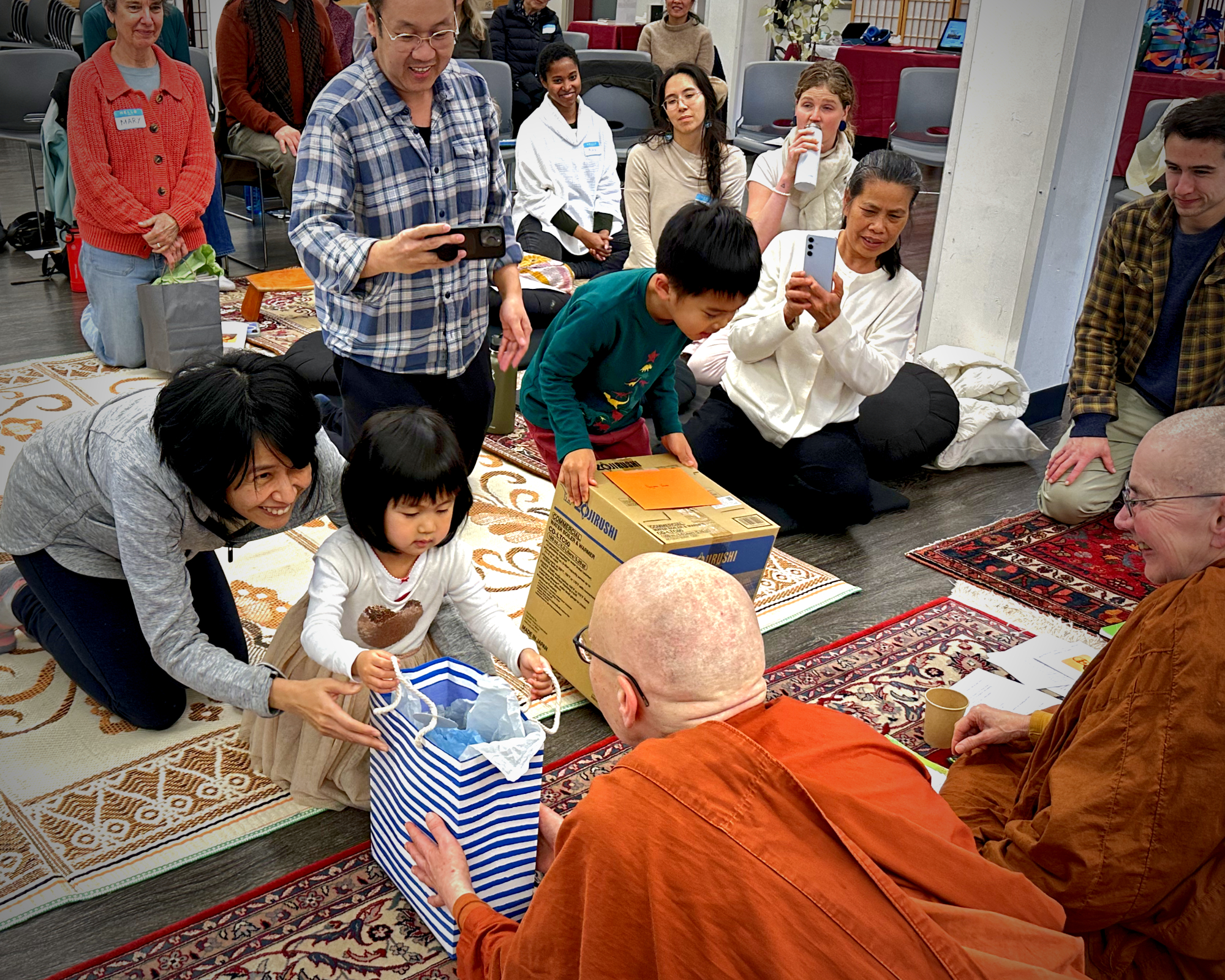 During the next segment, Kate made the formal offering of robe cloth to the sangha which was placed on a golden offering tray with a flower garland on top. The bhikkhunis led the recitation of a Sri Lankan refuge chant while the robe cloth was passed around to allow each attendee to participate and gain merit from the offering. Kate presented the robe bundle to the sangha, and a procession followed in which attendees offered gifts they had brought for the sangha. Two young children were present, and it was touching to see them offer spoonfuls of rice and gift bags to the bhikkhunis.